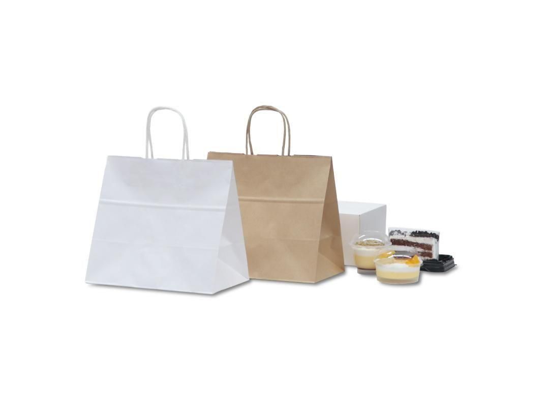 自動紐手提袋。安価で業務向けの手提袋です。汎用性の高い定番無地。マチ広でケーキなどの箱物にも対応。